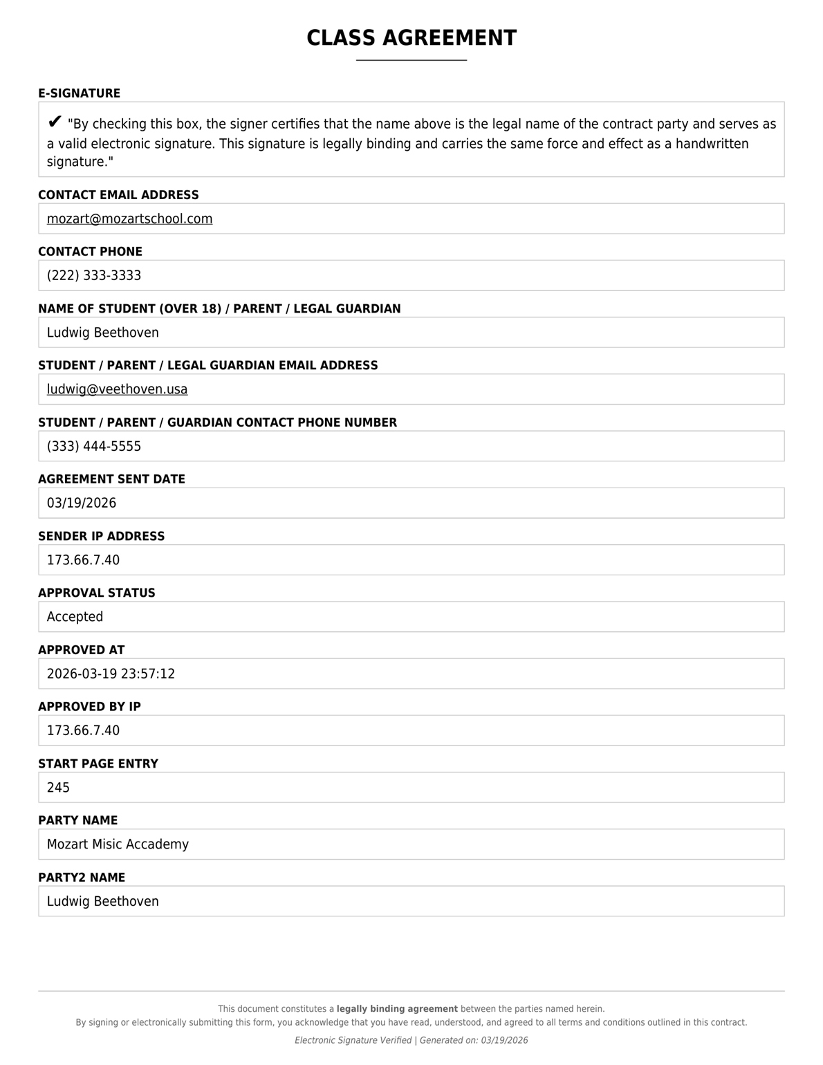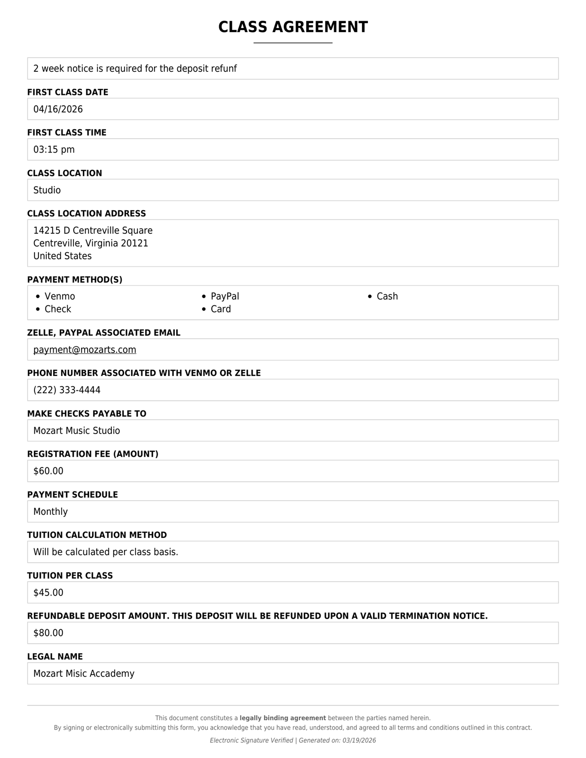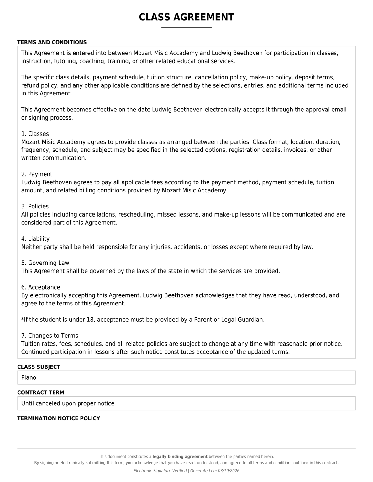 send a custom class | lesson agreement & get it Signed with a Click.